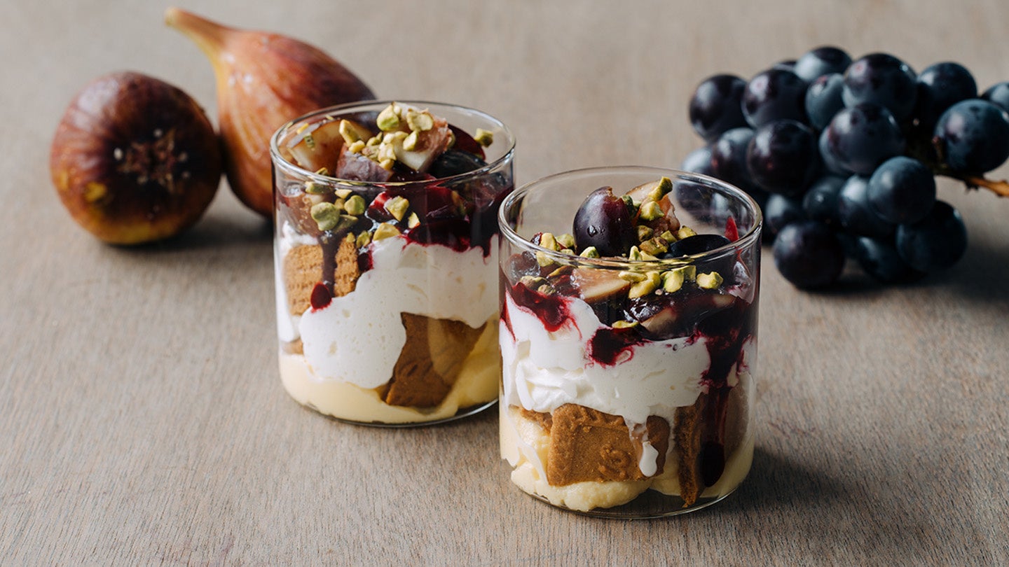 召しあがる際は、カップの底まで一気にスプーンを入れて、ひとすくい。まるでムースのようなカスタードクリームとマスカルポーネクリームをベースに、カラメル風味のシナモンクッキー、きゅっと酸味のきいたカシスソース、食べごろの無花果と巨峰、そして砕いたピスタチオ。様々な食感、味わい、香りが織りかさなった、秋を味わうプディングです。