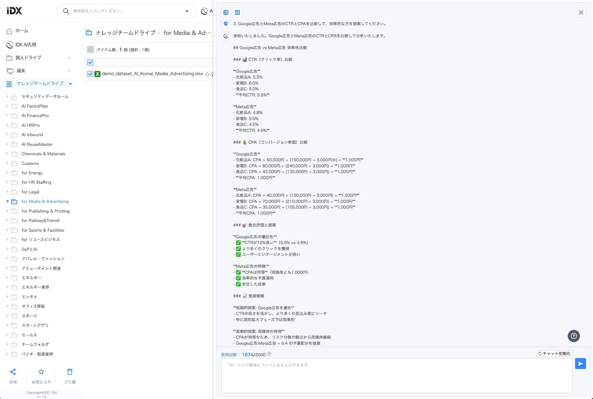 「AI孔明™ on IDX for Media & Advertising」 は、単なる広告管理ツールではありません。蓄積されたデータファイル・クリエイティブ知識・KPI履歴をもとに、“次の一手”を考えるプロセスを支援する戦略型AIモジュールです。