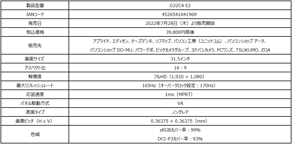 高い没入感と迫力の映像体験が可能な31.5インチ湾曲ゲーミングモニター 最大リフレッシュレート170Hz、応答速度1msの高スペックモデル 「G32C4 E2」発売