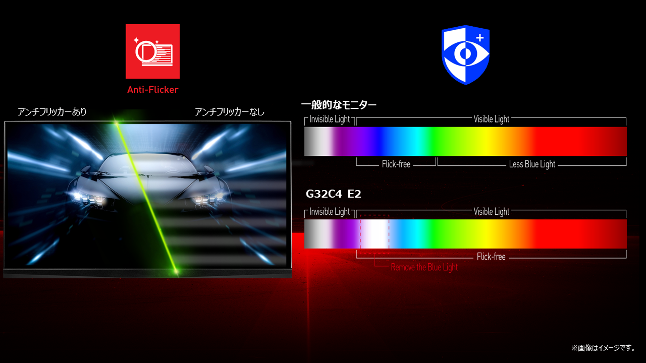 「G32C4 E2」は迫力のある31.5インチサイズと湾曲率1,500Rの液晶パネルを組み合わせる事で、高い没入感と短い視線移動で画面全体を把握する事ができ、リフレッシュレート170Hz(オーバークロック設定)・応答速度1msの高いスペックで、残像感の少ない映像で快適にゲームプレイを楽しむことが出来ます。また、同期機能としてFreeSync Premium、暗いシーンでも視認性を上げるナイトビジョン、長時間の使用において目の疲労を軽減するアンチフリッカー、ブルーライトカット機能を搭載しております。入力端子はHDMI 1.4b ×2、DisplayPort 1.2a ×1に対応しており、パソコンとゲーム機など複数の機器を接続し背面のジョイスティックを操作することで簡単に切り替えて使用することができます。