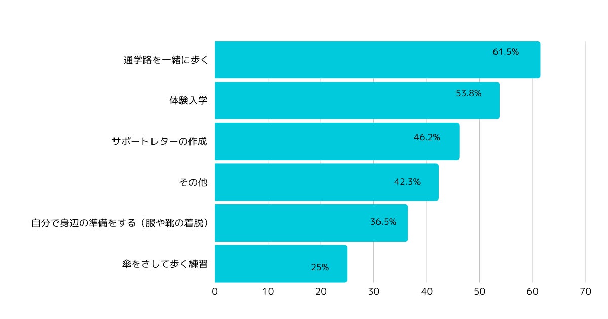 入学準備にあたり、親が不安に感じていたことはありますか?の回答の1~3位を見ても、4月からの学校生活が「わからない」ことによる不安がと大きいと推察されます。