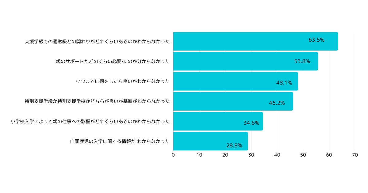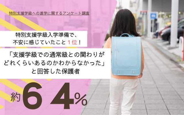 特別支援学級入学準備で、不安に感じていたこと1位は、「支援学級での通常級との関わりがどれくらいあるのかわからなかった」と回答した保護者6割以上