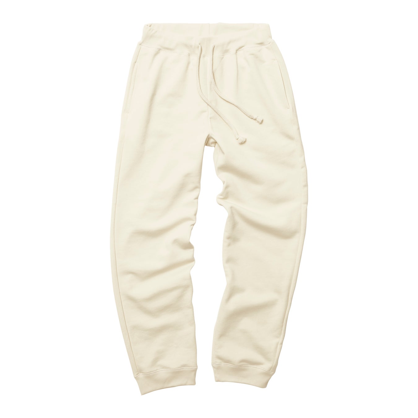 サイドとヒップの両方にポケットを備えており、ウエストは、調整可能な丸ひも付き(アダルトは外側、キッズは内側)。裾下はリブ仕様で、身頃とリブのつなぎ部分に入ったまたぎ2本針ステッチが、カジュアルな印象。