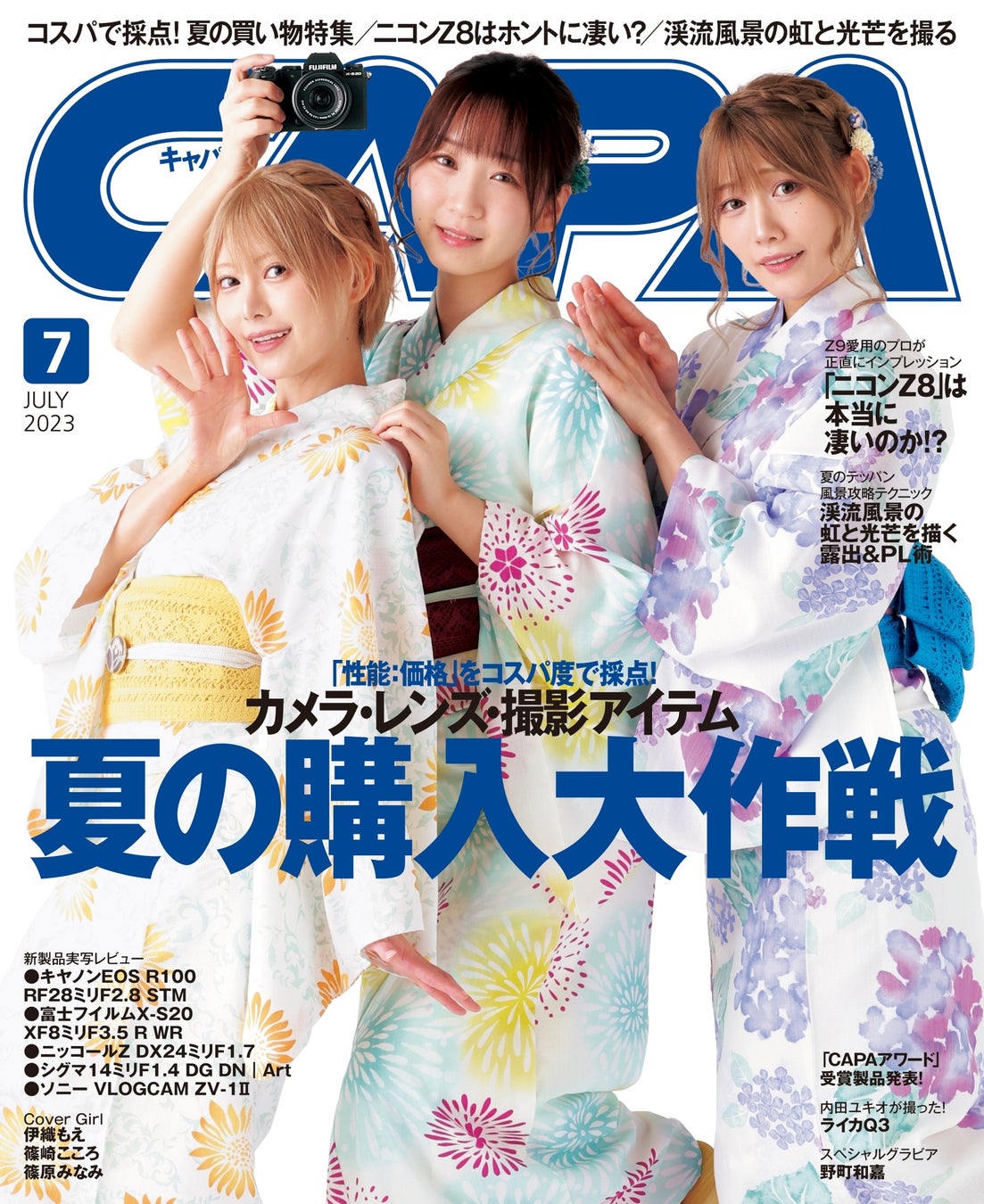特集は「さあ今だ! 夏の買い物ガイド」と題し、4本立てでお届け。「ニコンZ8深掘りレポート」「最旬機材を狙え、新製品レビュー」「コスパで検討! カメラ&レンズ選び」「効用で選ぶ写真用品」と、撮影機材からアイテムまで総ガイドします。風景撮影テクニックでは「渓谷や滝で”光芒&虹”のきらめきを狙う」、さらに読者投票でナンバーワンを決める「CAPA AWARD 2022-2023」の受賞製品発表もあります。CAPA7月号もカメラ・写真を楽しむための記事が満載です。