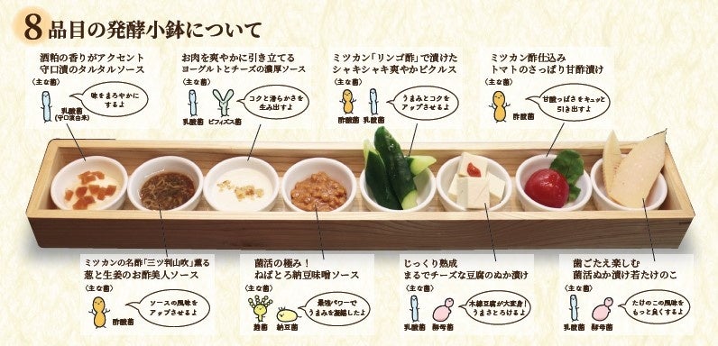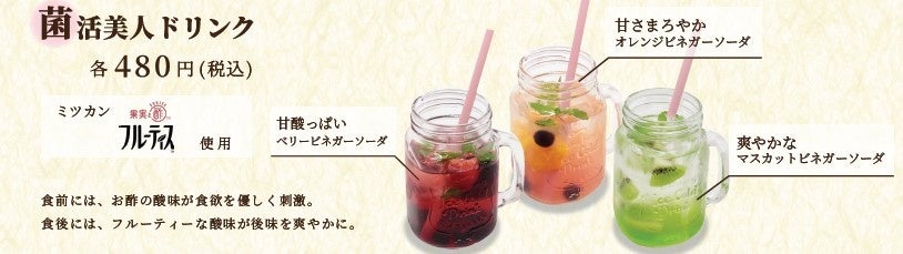 『発酵小鉢ごはん』は、様々な発酵食品を組み合わせた8種類の小鉢と共に、発酵食をより身近に感じていただけるメニューです。また、『菌活美人ドリンク』は、食前に飲めばお酢の力が食欲を優しく刺激し、食後にはフルーティーな酸味がさわやかさをもたらします。