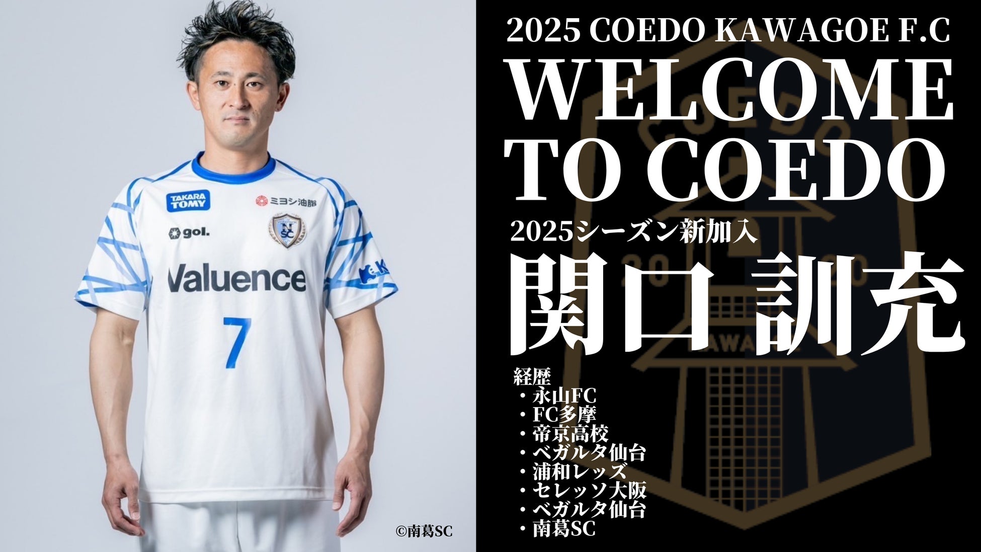 この度、2025シーズンより、関東1部リーグに所属する南葛SCより、サッカー日本代表選出経験ならびに、Jリーグ公式戦通算542試合の出場経験を持つ関口訓充選手がCOEDO KAWAGOE F.Cへ加入することが決定しましたので、お知らせします。