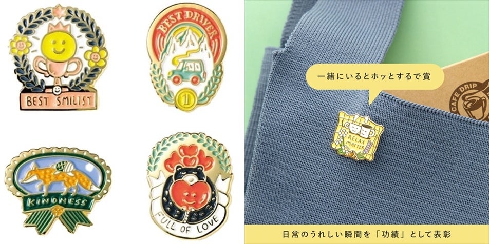 相手にぴったりの“賞”を選んで贈れる、勲章型のピンズ。キラリと金色に輝く勲章のような楽しいデザインと可愛い手書き文字の称号もこだわりのポイントです。二つ折り台紙の封を閉じると、そのまま贈れるギフトラッピングになります。
