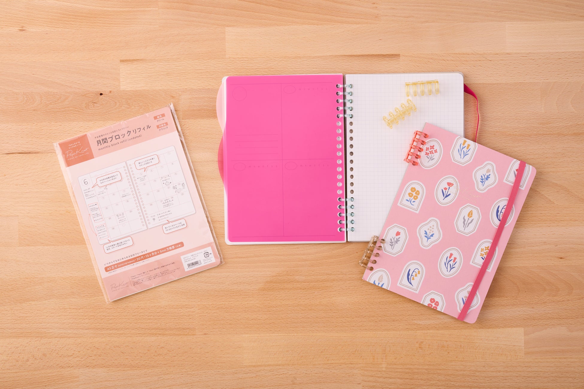 「パピノット」は、自分の好みにあわせてゴム付きカバーとリング、リフィルを組み合わせてカスタマイズできるA5サイズのノート。自分好みのカバーとリングを自由に組み合わせることで、愛着の湧くオリジナルノートができあがります。