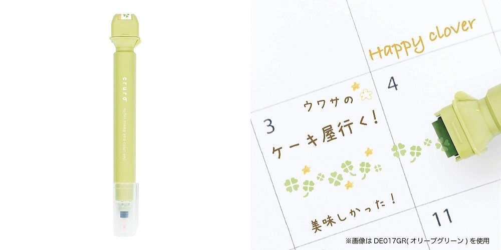 カラーペン一体型のローラースタンプ。連続して押印できる回転式の浸透印(40~50m印字可能)です。ペン先0.5mmの水性カラーペンは、スタンプに合わせて描き足しを楽しめます。