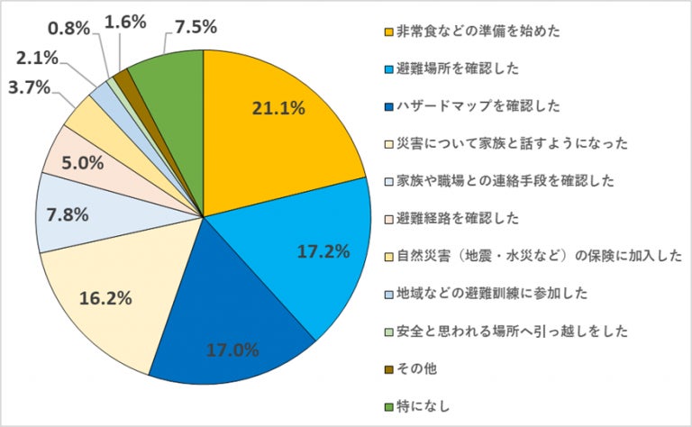 前問に対して、具体的にどのような変化がありましたか?の質問では「非常食などの準備を始めた」が21.1%、「避難所の確認をした」が17.2%、「ハザードマップを確認した」が17.0%、「災害について家族と話すようになった」が16.2%と上位4つは、大差ない結果となりました。