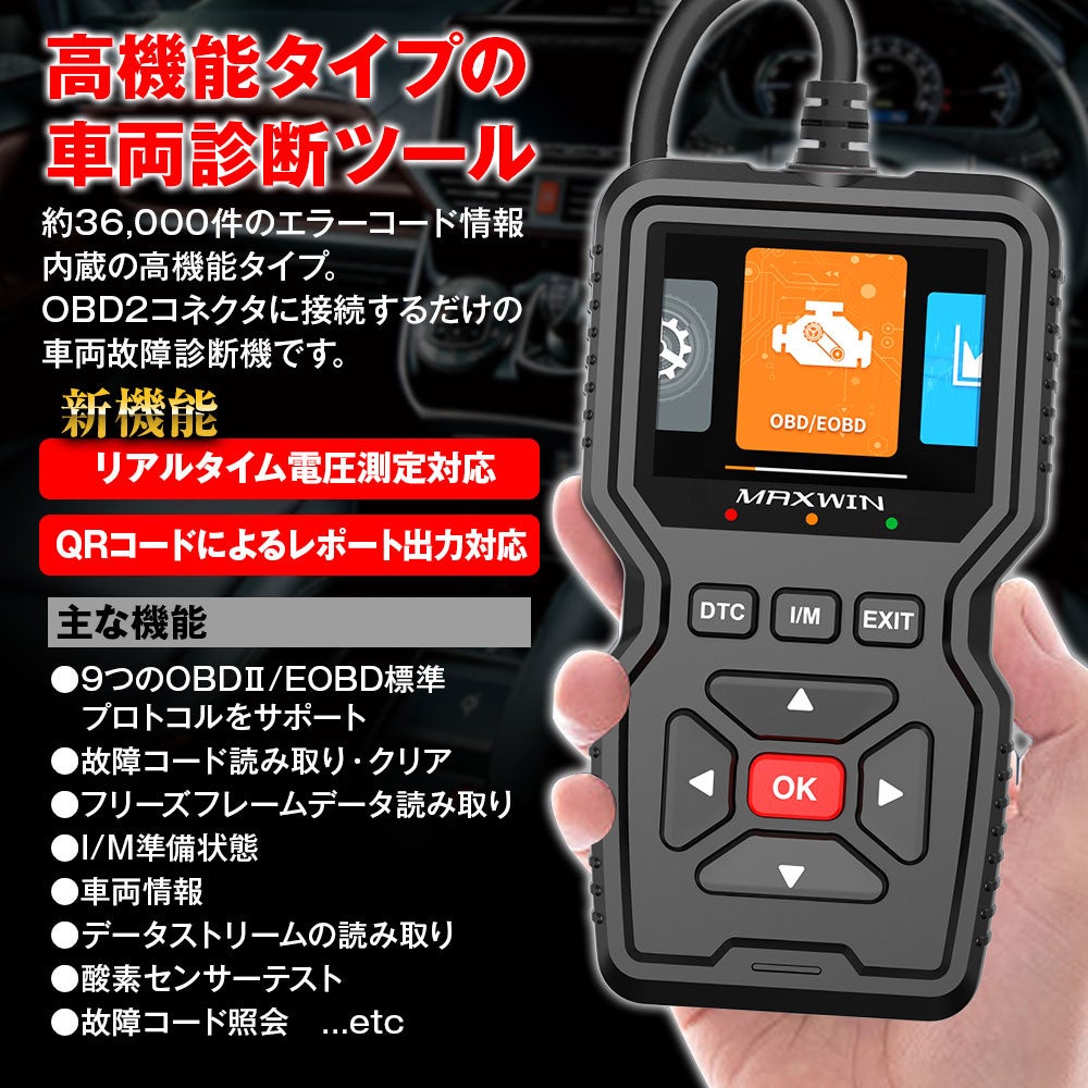 約36000件の故障コード情報内蔵。9つのOBD2/EOBD標準プロコトルに対応。