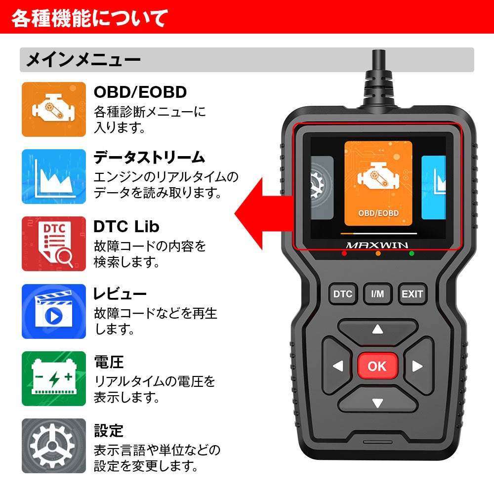 故障コード読み取り・クリア、フリーズフレームデータ読み取り、I/M準備状態、車両情報、データストリームの読み取り、電圧の読み取り、酸素センサーテスト、故障コード照会などをサポートしています。