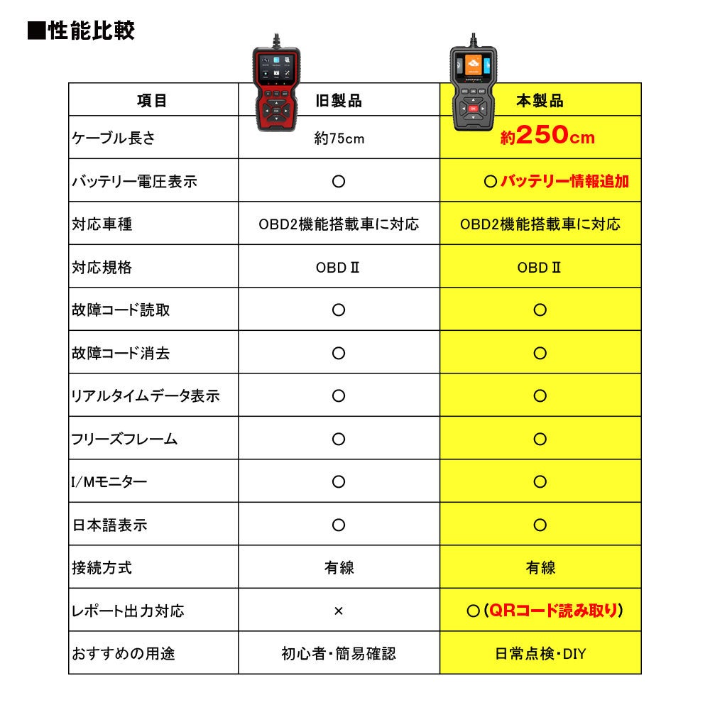 車両故障コードを迅速に読み取ります。故障コードをクリアする機能も搭載。