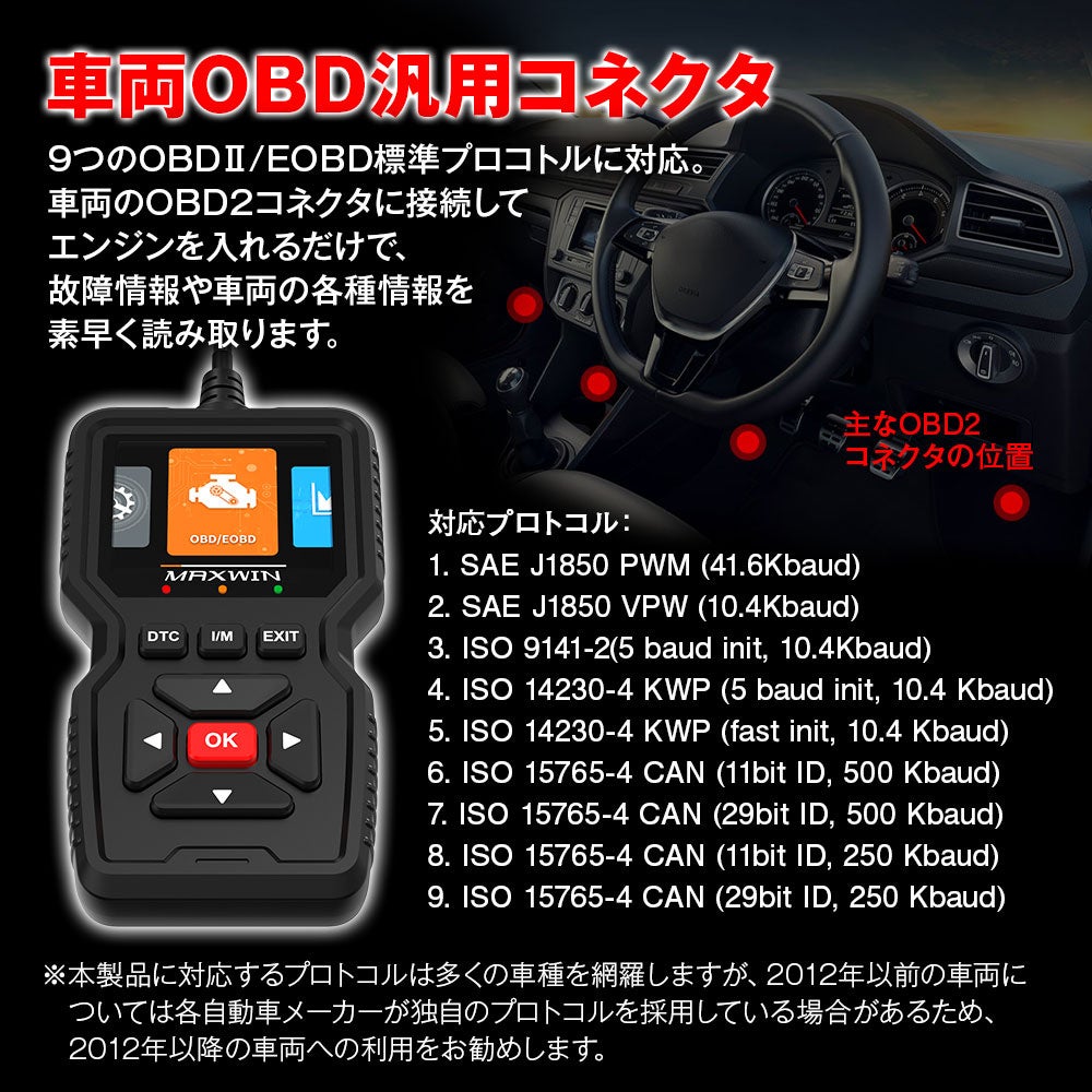 9つのOBD2/EOBD標準プロトコルをサポート