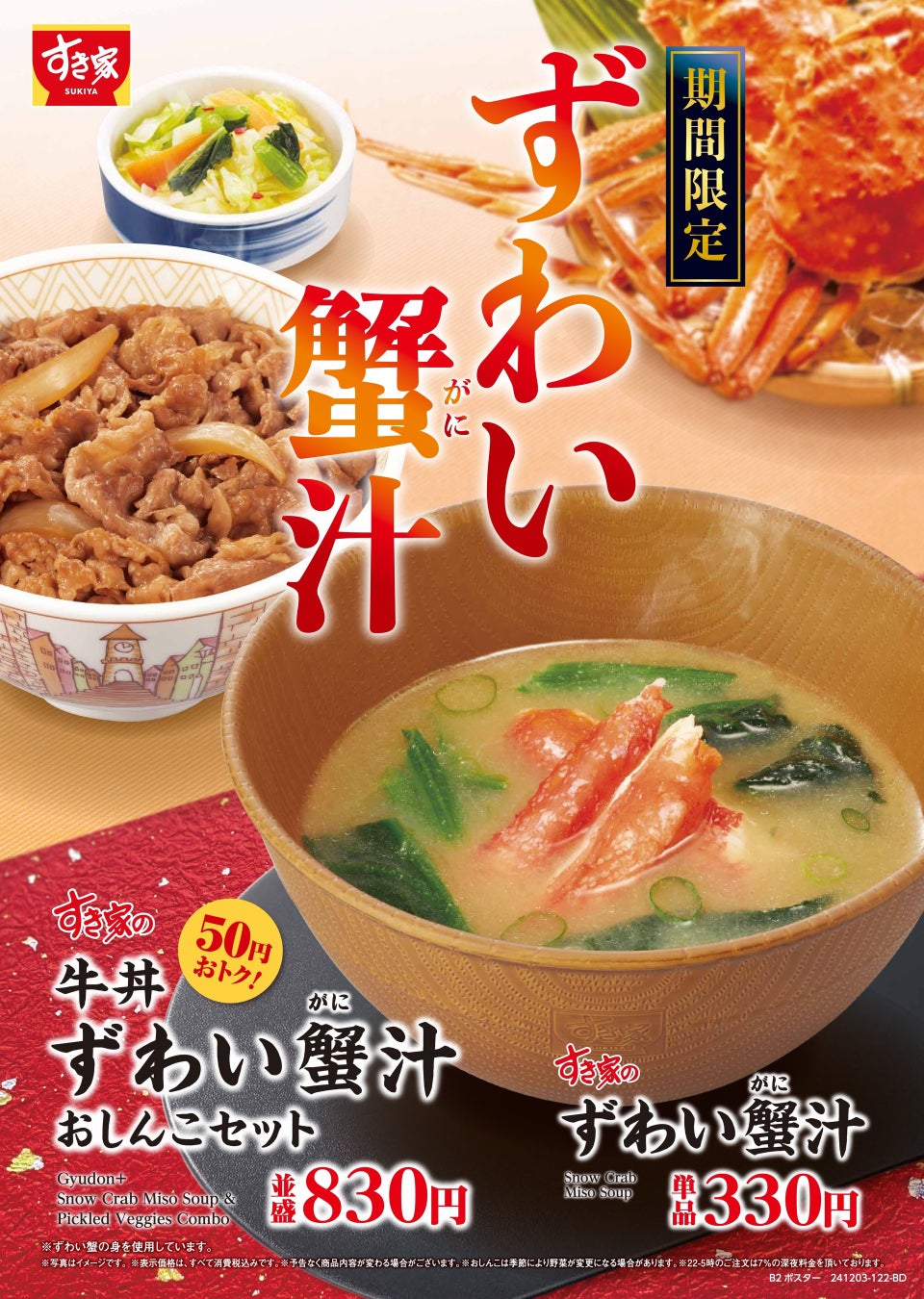 ぜひこの機会にお近くのすき家で、年末年始にぴったりの贅沢な「ずわい蟹汁」をお楽しみください。