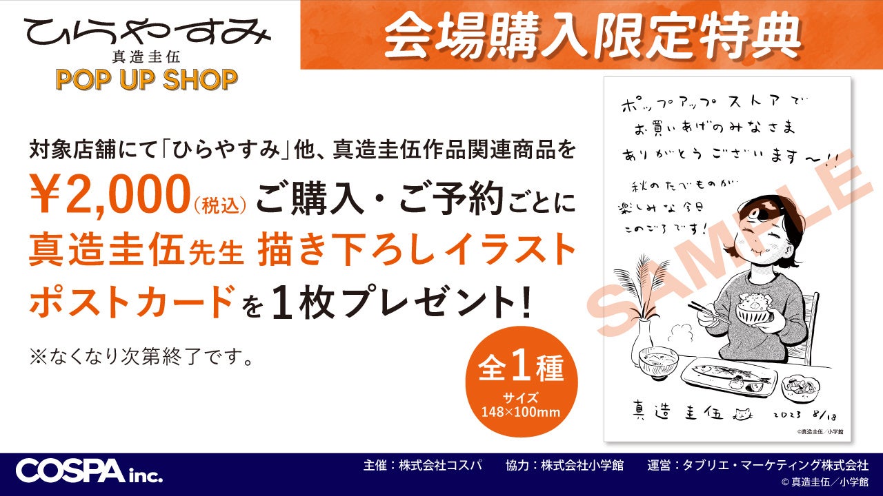 各会場・会期中に「ひらやすみ」他、真造圭伍作品関連商品を2,000円(税込)ご購入・ご予約ごとに、【真造圭伍先生描き下ろしイラストポストカード】を1枚プレゼント!