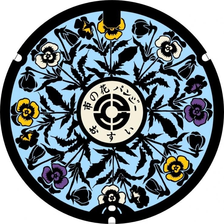 鴻巣市の花き栽培として最初に生産された「パンジー」をデザインしたマンホール蓋です。