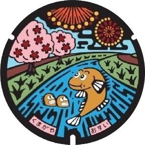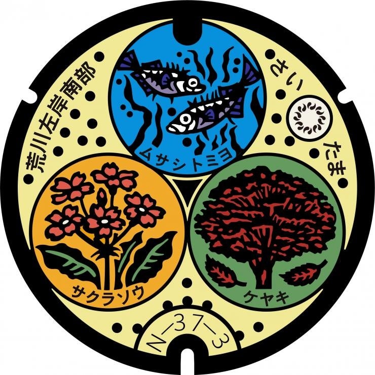 荒川清流やさくら祭、花火大会を描き、県の魚「ムサシトミヨ」をデザインしたマンホール蓋です。