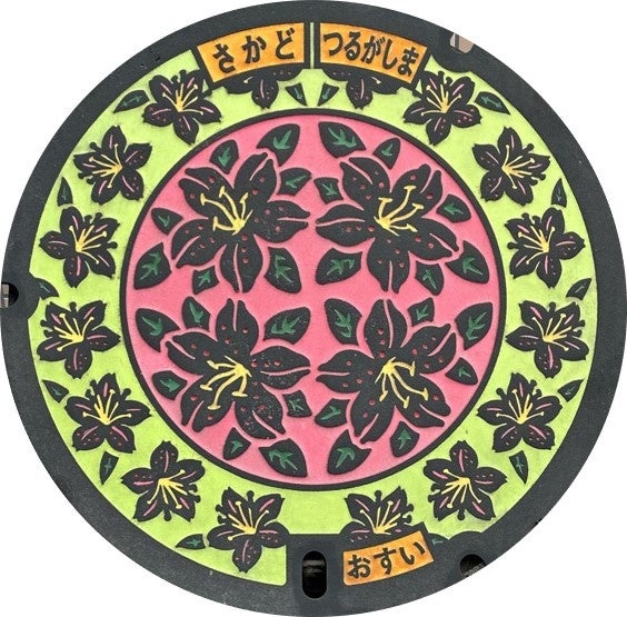 坂戸市の花「サツキ」と鶴ヶ島の花「ツツジ」をイメージしたデザインマンホール蓋です。