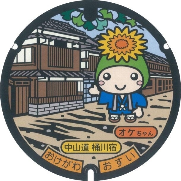 桶川市マスコットキャラクター「オケちゃん」が中山道桶川宿を散策する様子を描いたマンホール蓋です。