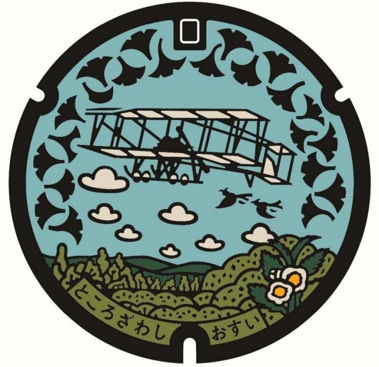 所沢市初のデザインマンホール。アンリ・ファルマン号と、市の木「いちょう」の葉が舞うデザインです。