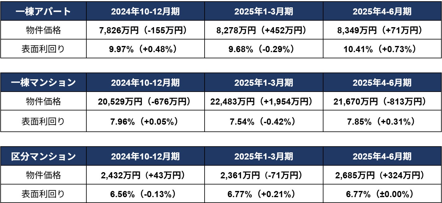 ・一棟アパート価格が上昇し、2四半期連続で過去最高額を記録