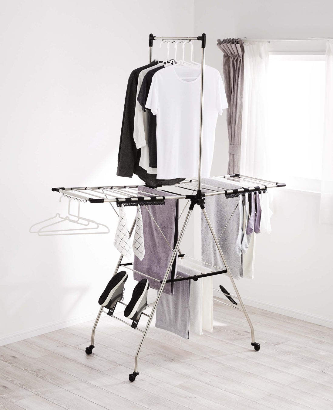 省スペースでたっぷりの衣類を部屋干しできるステンレスの物干し。