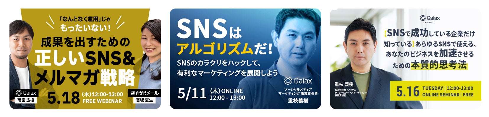 ガイアックスは、最新のSNSトレンドやSNS活用の考え方、炎上対策など、企業のマーケティング・広報担当の方々向けの無料セミナーを定期開催しています。最新のセミナー情報は以下よりご覧ください。