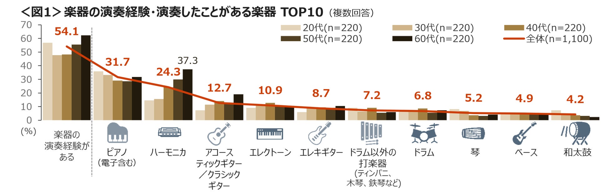 楽器の演奏経験がある人は54.1%。演奏したことがある楽器は「ピアノ(電子含む)」が31.7%と最も高く、「ハーモニカ」「アコースティックギター/クラシックギター」と続く。