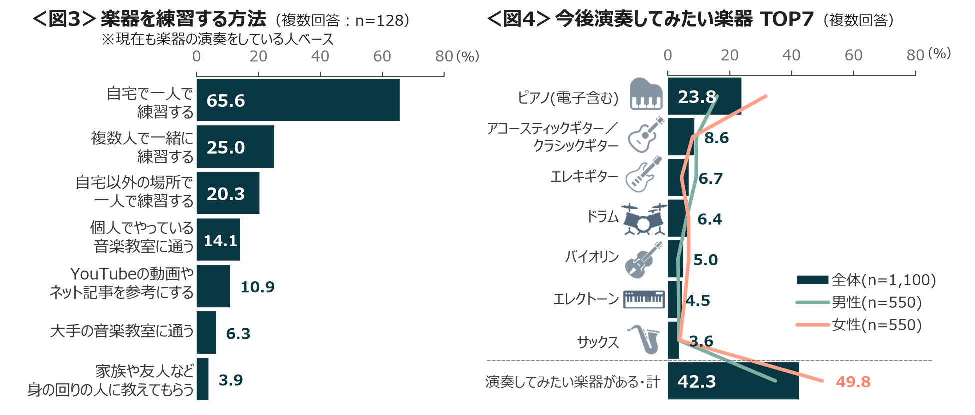 今後演奏してみたい楽器がある人は42.3%。演奏してみたい楽器でも「ピアノ(電子含む)」が1位。