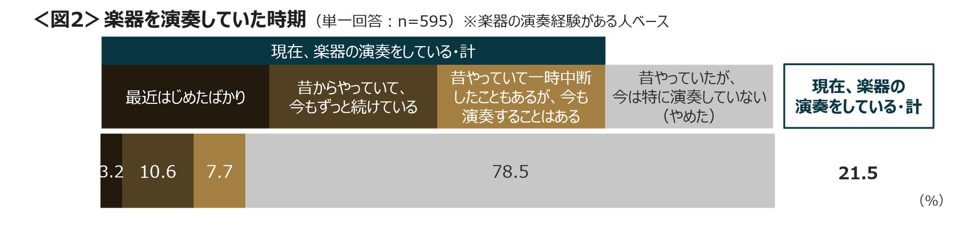 楽器の演奏経験者のうち、現在も演奏をしている人は2割で、「昔やっていたが、今は演奏していない」が多数。<図2>