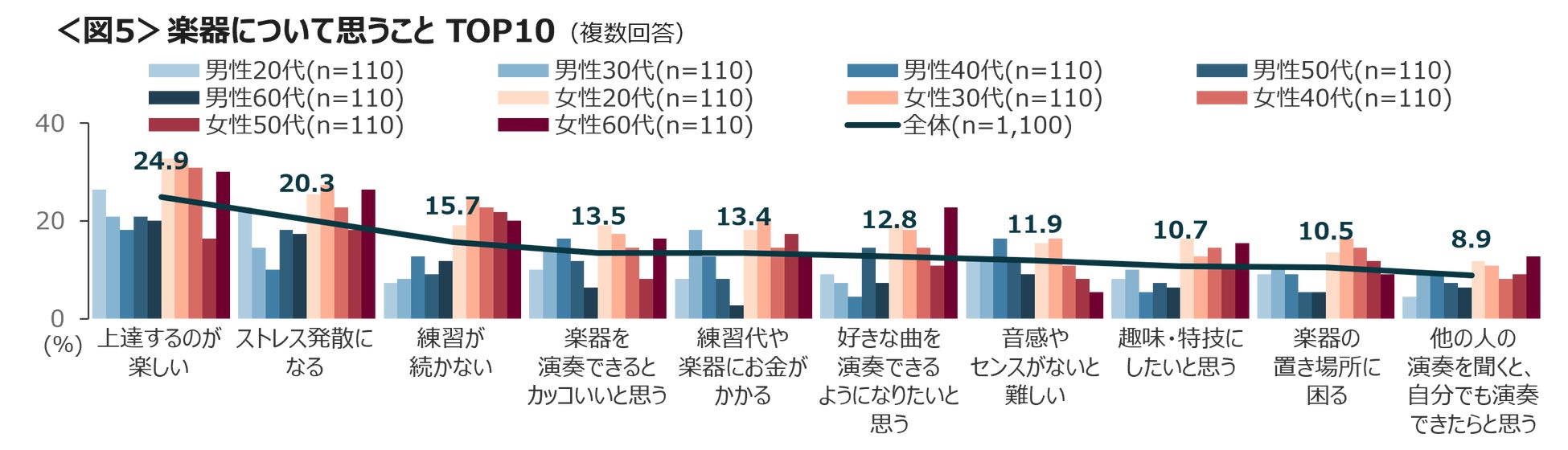 特に女性20代・30代・60代では上位2項目に加え、「楽器を演奏できるとカッコイイと思う」「好きな曲を演奏できるようになりたいと思う」などが高く、楽器演奏に対して前向きな様子がうかがえる。<図5>