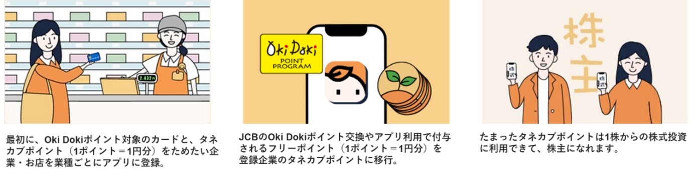「タネカブ」は、JCBカード(※1)の利用で付与されるOki Dokiポイント(※2)との交換や、専用のタネカブアプリの利用により獲得できるタネカブポイントで、取り扱い企業の株式を1株から購入できるサービスです。(※3)株式の購入については、マネックス証券の単元未満株サービスである「ワン株」を利用することで口座開設・維持費や単元未満株式の買付手数料が無料となります。