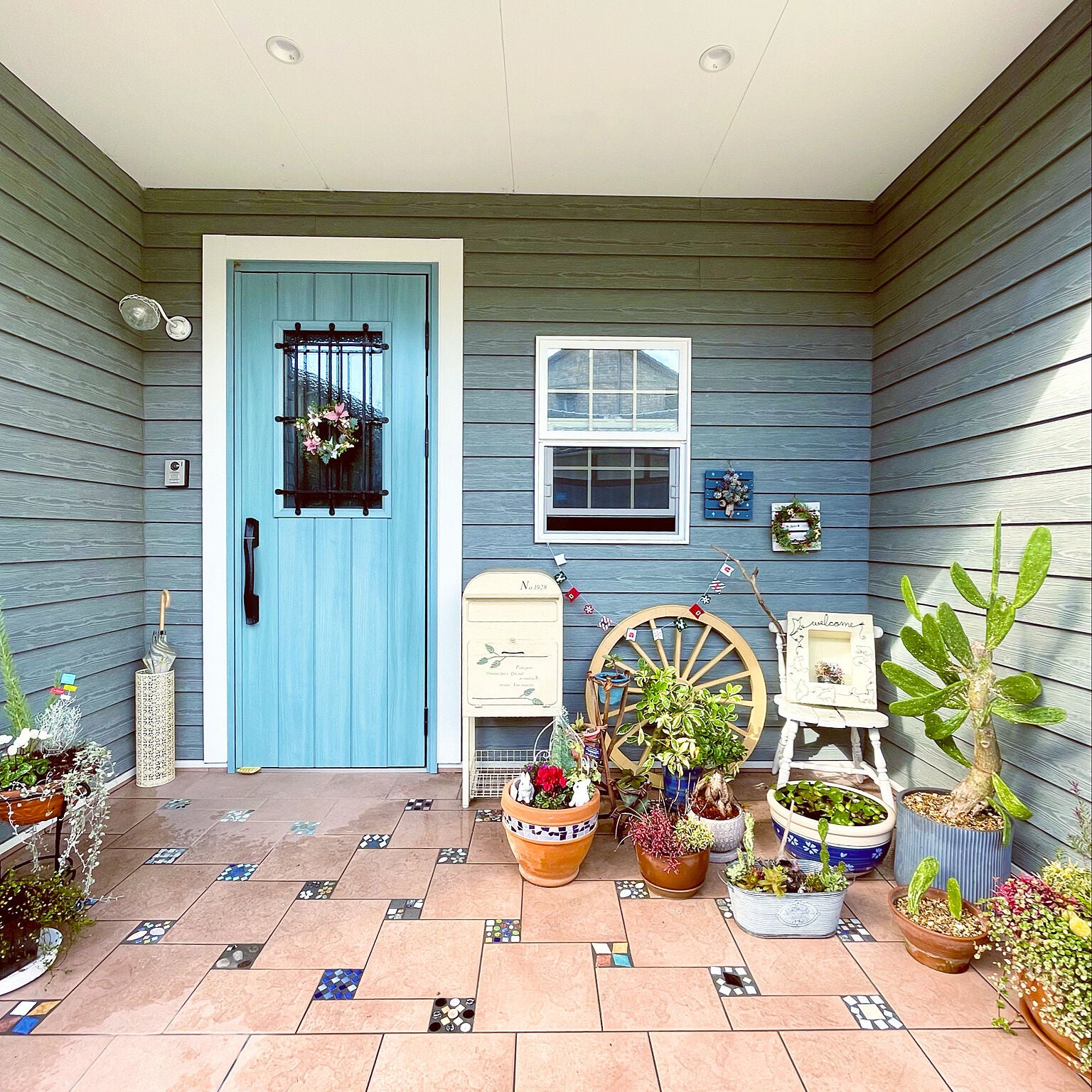 美しいブルーグレーの壁に、玄関ドアと額縁の色合いがマッチした素敵な玄関空間です。遊び心のあるタイルや、季節感のあるディスプレイ演出からはおもてなしの心配りが感じられます。