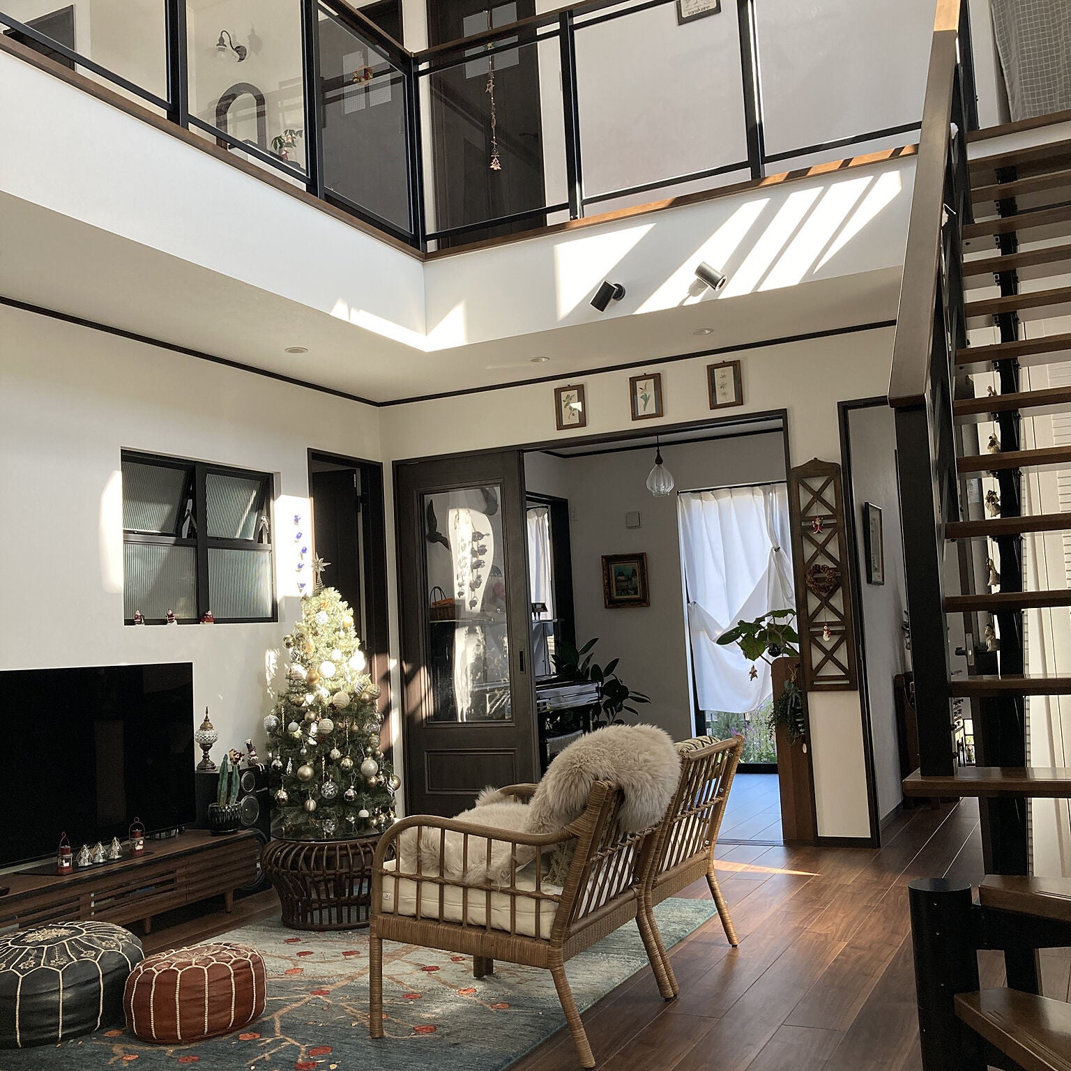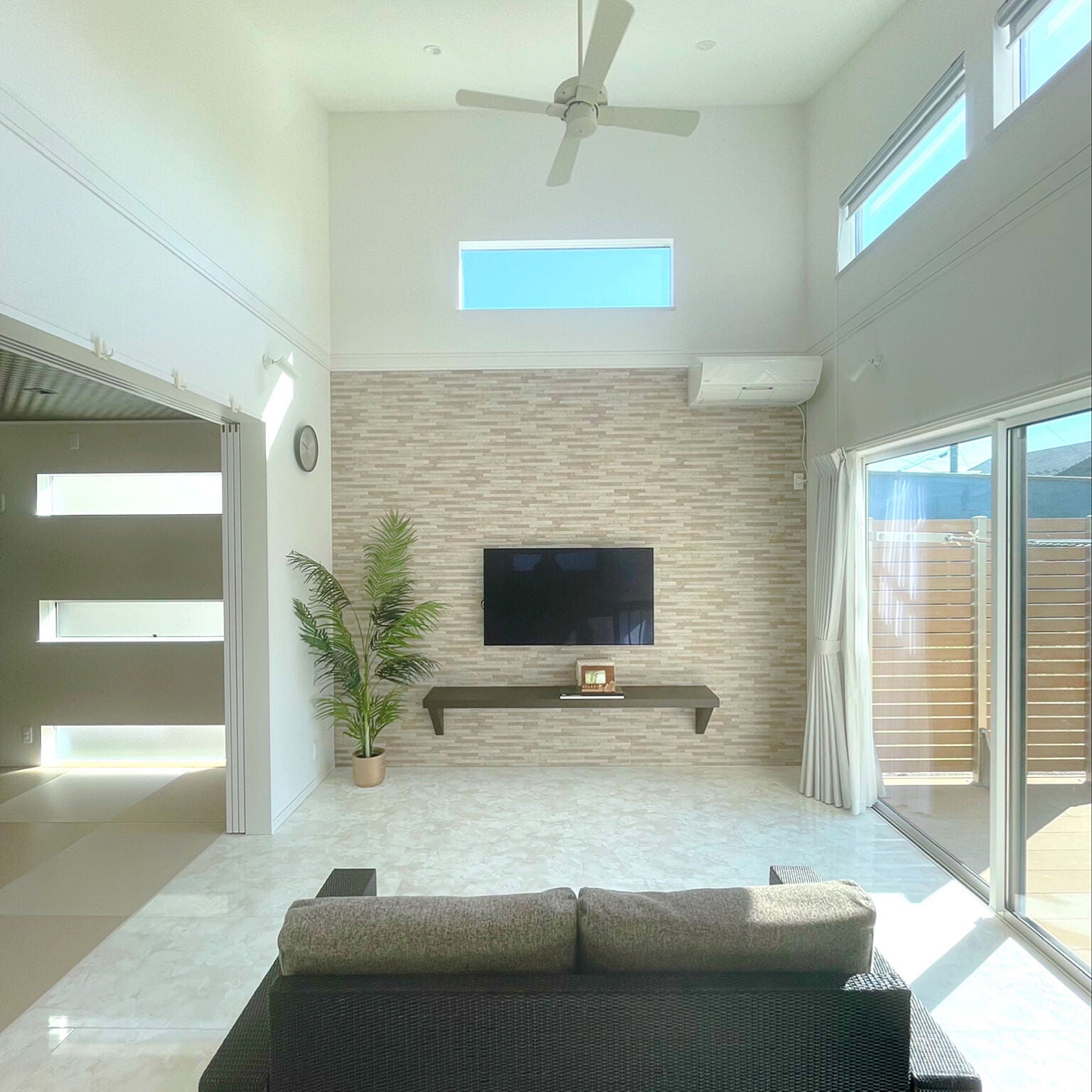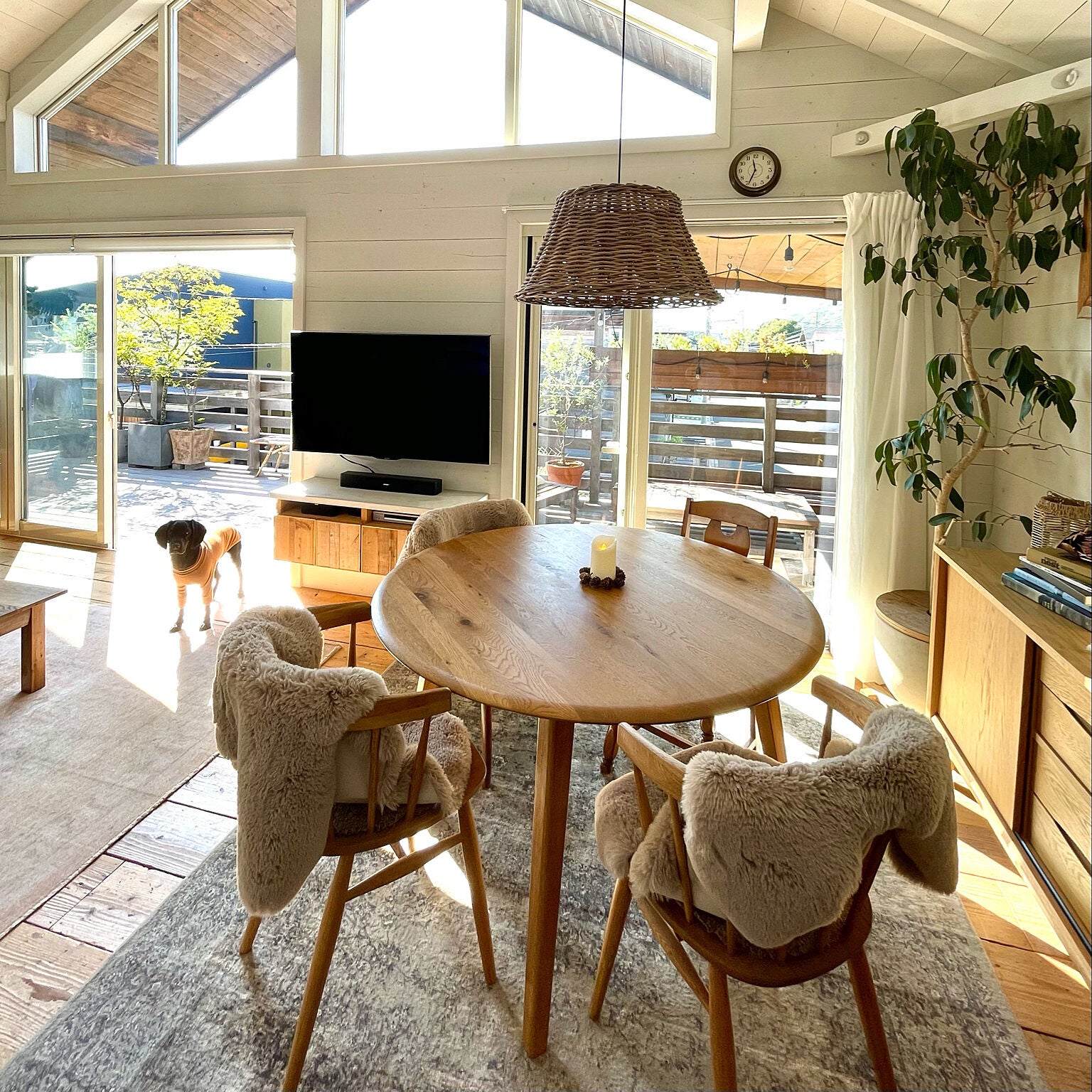 三角屋根の大きな窓が魅力的な、明るく開放感ある空間です。ホワイトを基調に、インテリアが醸し出すリラックスした雰囲気からは居心地の良さを感じます。連続したリビングとデッキは、ワンちゃんにも嬉しい空間です。