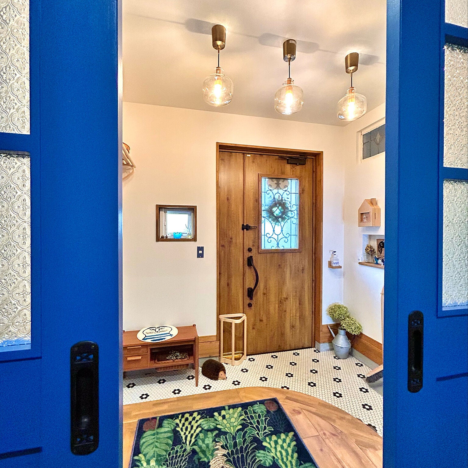 室内引戸のあざやかなブルーと玄関ドアのアイアン調のデザインがとてもマッチしています。インテリアや小物使いもオシャレで、毎日のお出かけが楽しくなりそうな心はずむ玄関空間です。