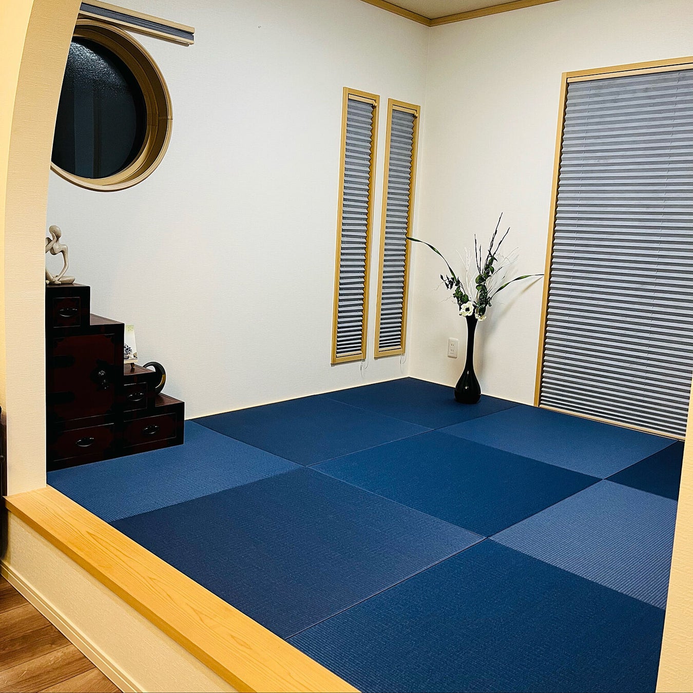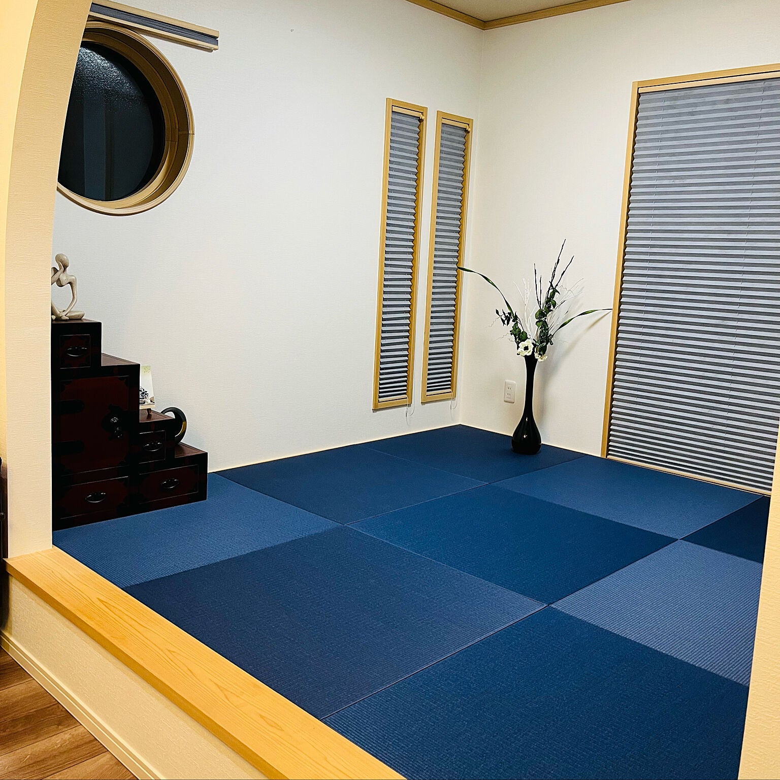 小上がりに機械抄き和紙表の〈藍色〉を採用された、個性的でありながら落ち着いた和空間です。ヘリなし半帖サイズの市松敷きの視覚効果で、よりスッキリと広い空間に感じられます。