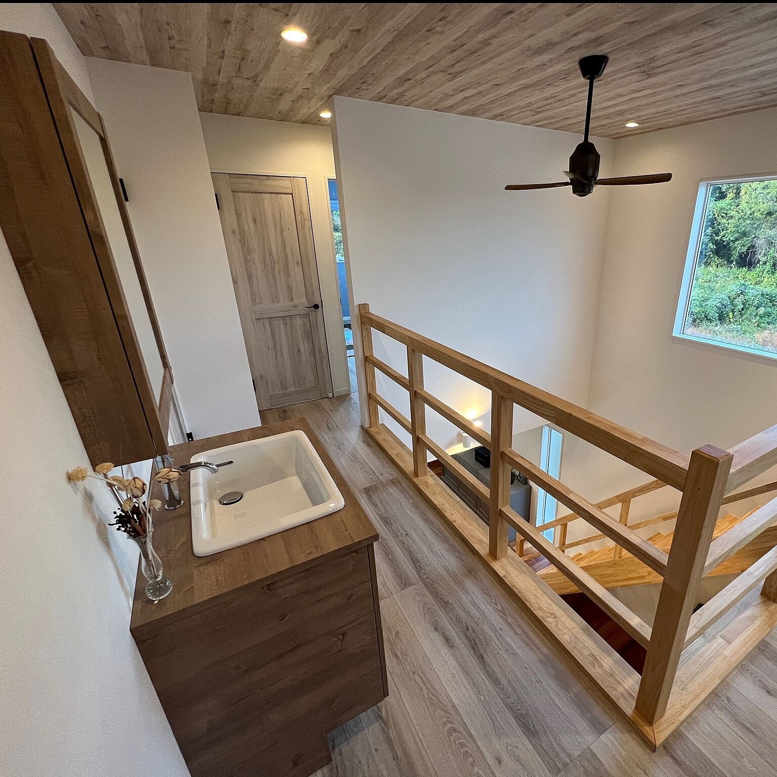 明るい吹き抜けにふんだんに取り入れた木目柄とホワイトの組み合わせに洗面台が馴染んでいます。開放感のある空間で、朝や就寝前の身支度でリフレッシュできそうです。