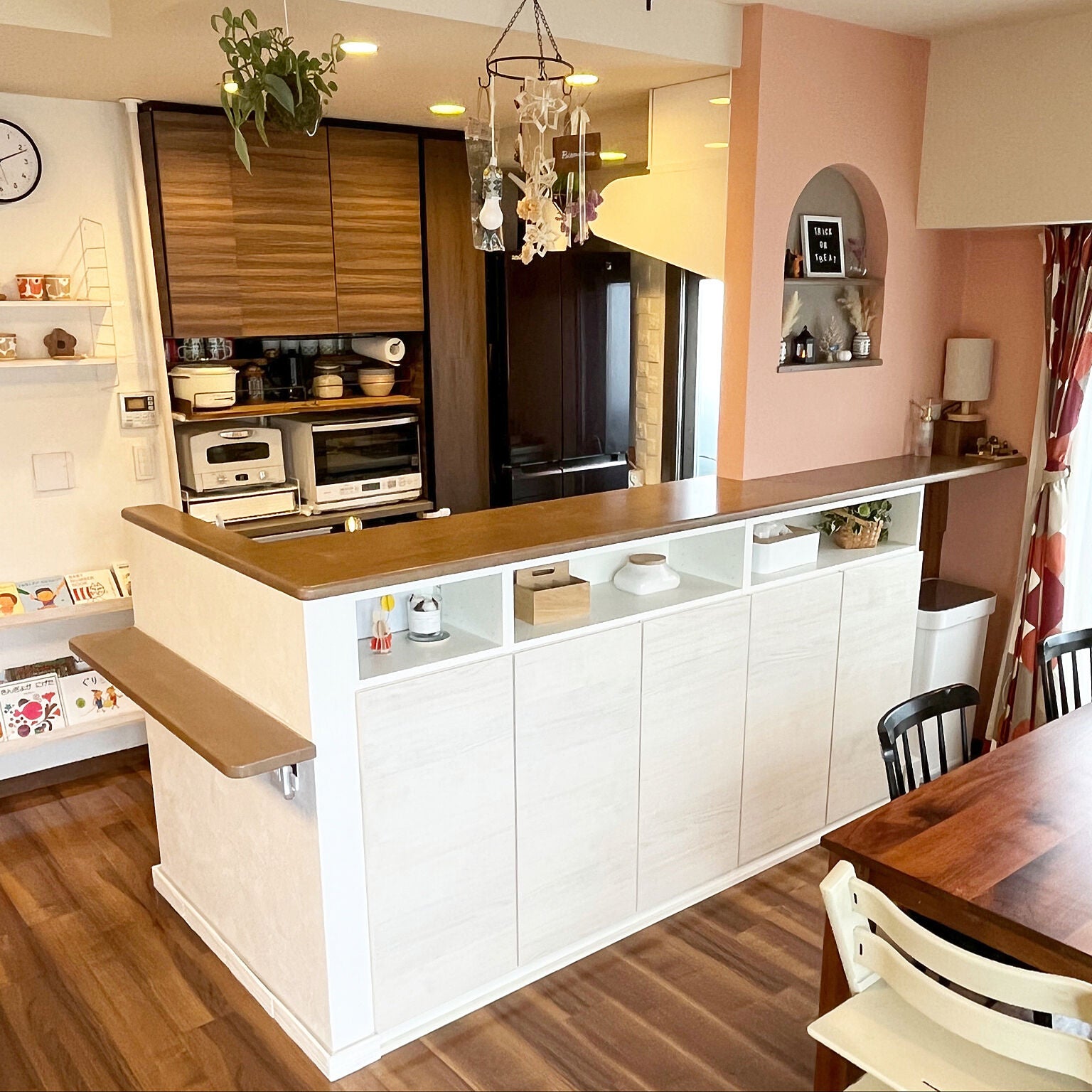 木の温もりを感じる空間に、同色系のキッチンカウンターを合わせた統一感のあるコーディネート。その下にはDAIKENのオーダータイプの収納『MiSEL』を採用されたことで、実用性にも優れています。