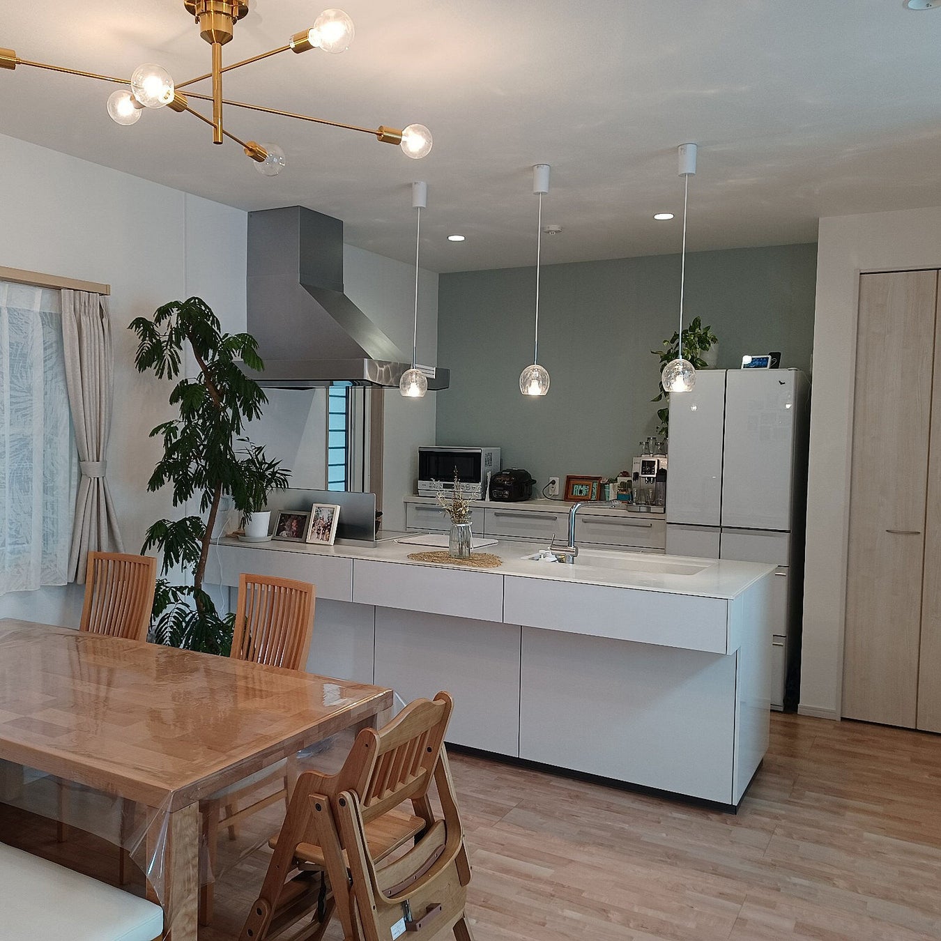明るく清潔感のある空間にオープンキッチンが溶け込み、心地よさを感じ、家族の団らんが目に浮かびます。ガラス製のペンダントライトとクリスタルカウンターの素材の組み合わせが魅力的です。