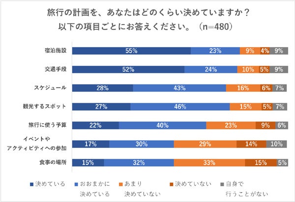 食事の場所やイベント・アクティビティへの参加など、一般的に選択肢が豊富でオプション的な要素として捉えられることが多いものに関しては、「あまり決めていない」「決めていない」と答える人が多い結果となっています。