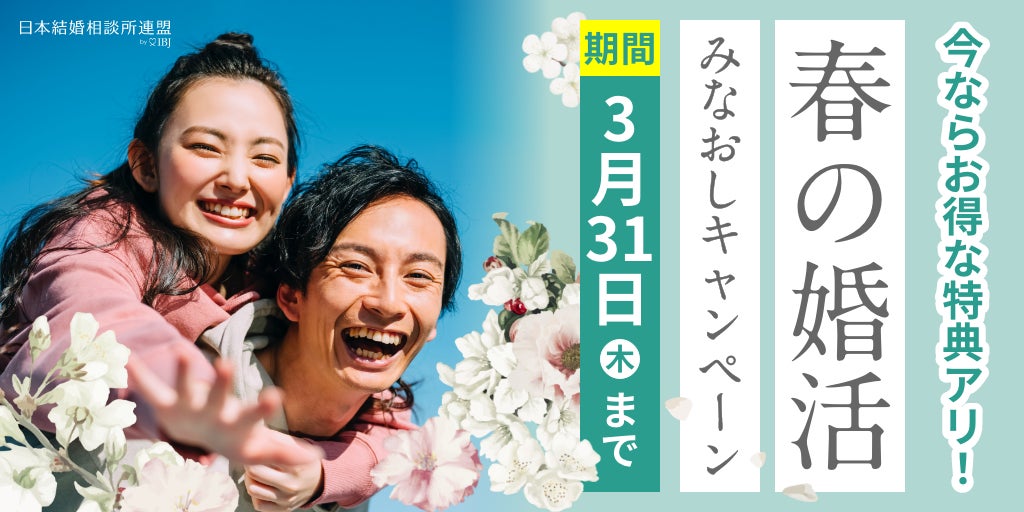 株式会社IBJ(代表取締役社長:石坂茂、東京都新宿区、東証一部:6071)が運営する、日本一*の成婚数を誇る結婚相談所ネットワーク『日本結婚相談所連盟』は、2022年3月1日(火)~3月31日(木)の期間中、全国の加盟相談所と連携した『春の婚活みなおしキャンペーン』を実施。期間中、Amazonギフト券10,000円が5名様に当たるTwitter企画も!