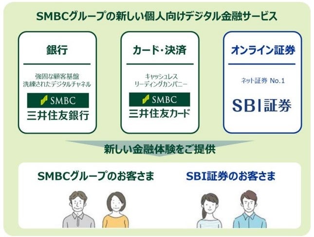 具体的には、SBI証券が、SMBCグループの個人向けデジタル金融サービスにおける証券関連サービスの提供主体となり、既に三井住友銀行の“SMBCダイレクト”や三井住友カードの“Vpass”をご利用しているお客さま、そして、新たに三井住友銀行や三井住友カードとお取引されるお客さまに対して、SBI証券のオンライン証券サービスをシームレスな形で提供します。各社は、既存サービスのデジタル化を進め、未だかつてない利便性と利得性を持ったサービスを提供してまいります。