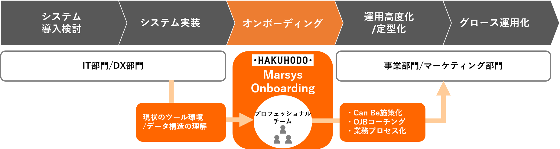 そこで重要なのが、システム構築フェーズとグロース運用化の橋渡しとなる、オンボーディングのプロセスです。このプロセスにおいて企業の担当者に博報堂のプロフェッショナル人材が並走して、デジタルマーケティング実行の体制づくり、マーケティングツールへの習熟、業務プロセス化を実施することで、以降のグロース運用化へと繋がっていきます。