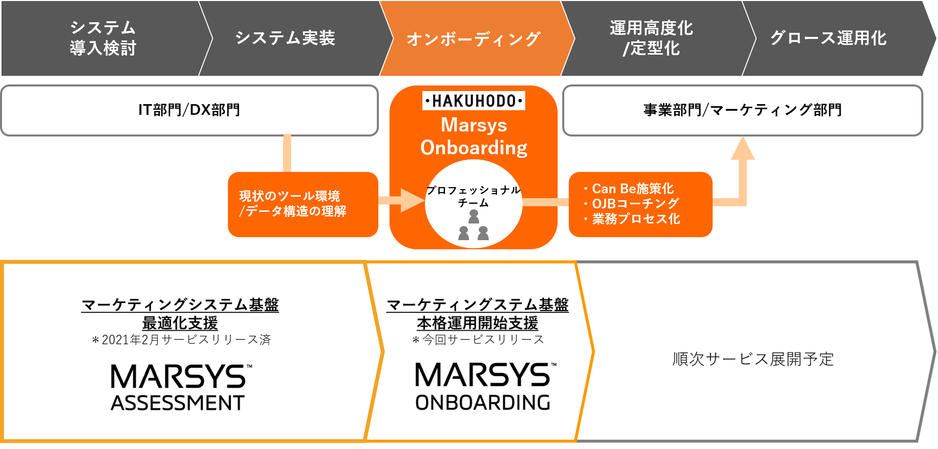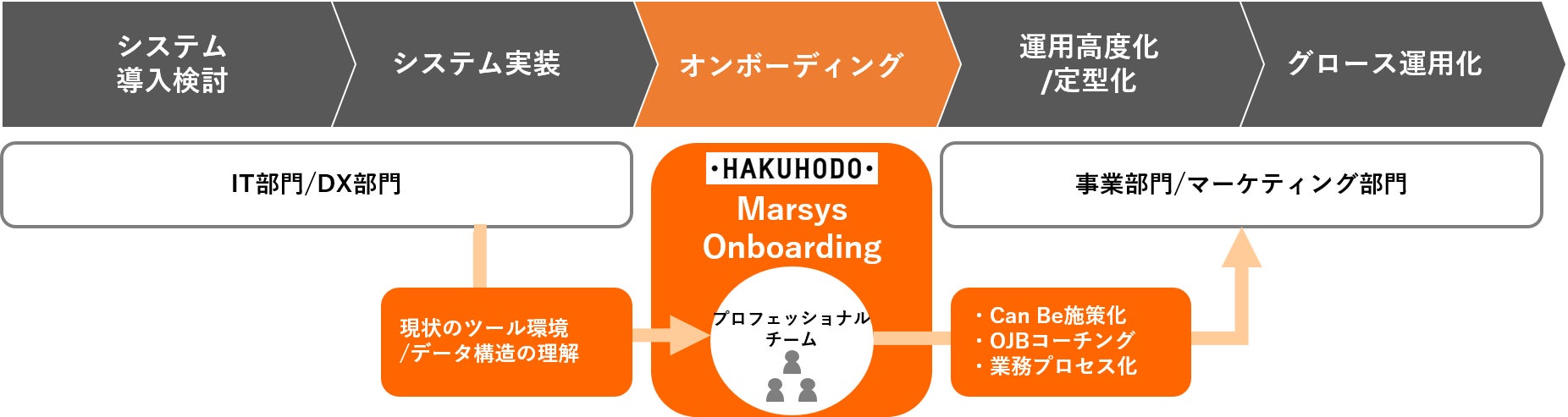 「HAKUHODO Marsys Onboarding」は、これまで博報堂が培ってきたデジタルマーケティングオペレーション支援のノウハウを体系化したプログラムを活用し、プロジェクト経験豊富なデジタルマーケティング専門人材がクライアント企業のマーケティングチームに並走しながらOJT形式で知識や技術を提供するオンボーディングプロセスを支援するサービスです。単なるマーケティングツールの利活用支援に留まらず、各企業において内部人員主導でのグロース運用化を可能にすることで、クライアント企業の事業成長につながる一助となることを目的としています。