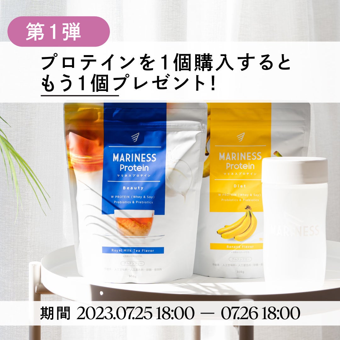 期間中、MARINESS公式ECサイトにてプロテイン約14回分を1個ご購入いただいたお客様にプロテイン約14回分をもう1個プレゼントいたします。プレゼントのフレーバーはお好きなものをお選びいただけます。