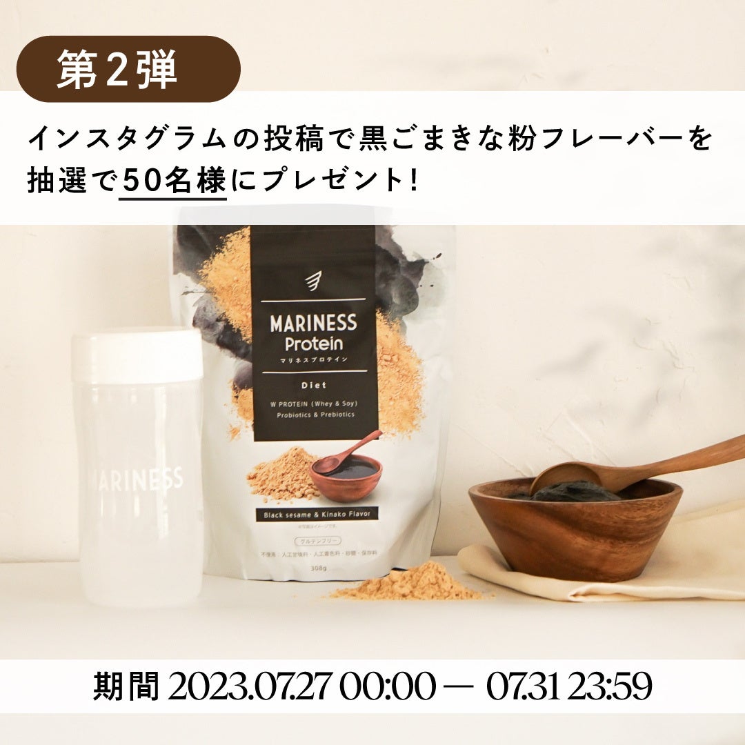 ・抽選で50名様に、「マリネスプロテイン 黒ごまきな粉フレーバー約14回分」をプレゼントいたします