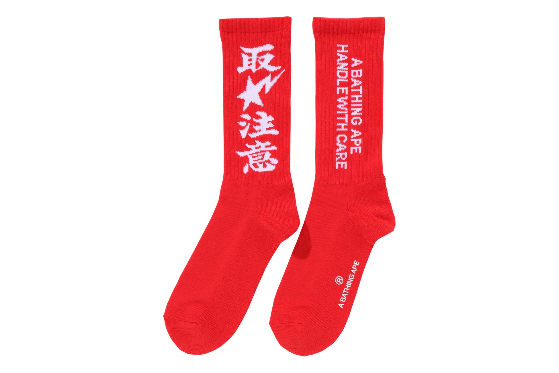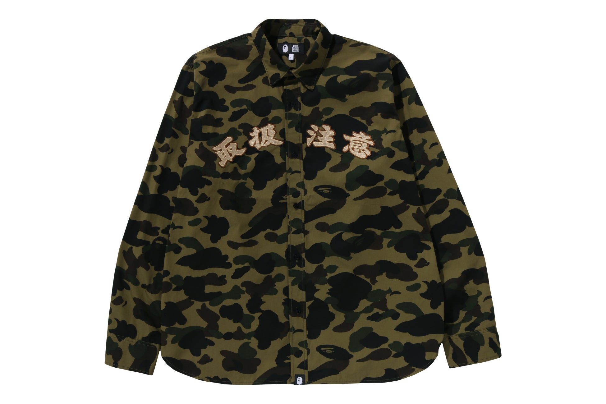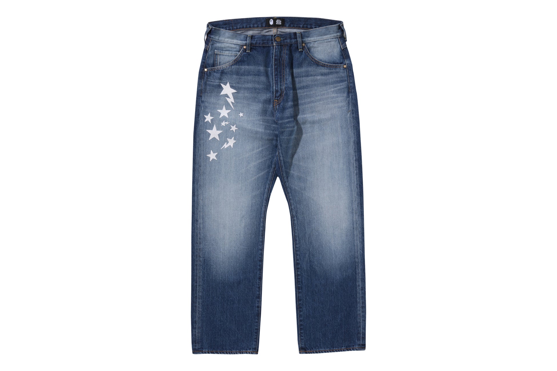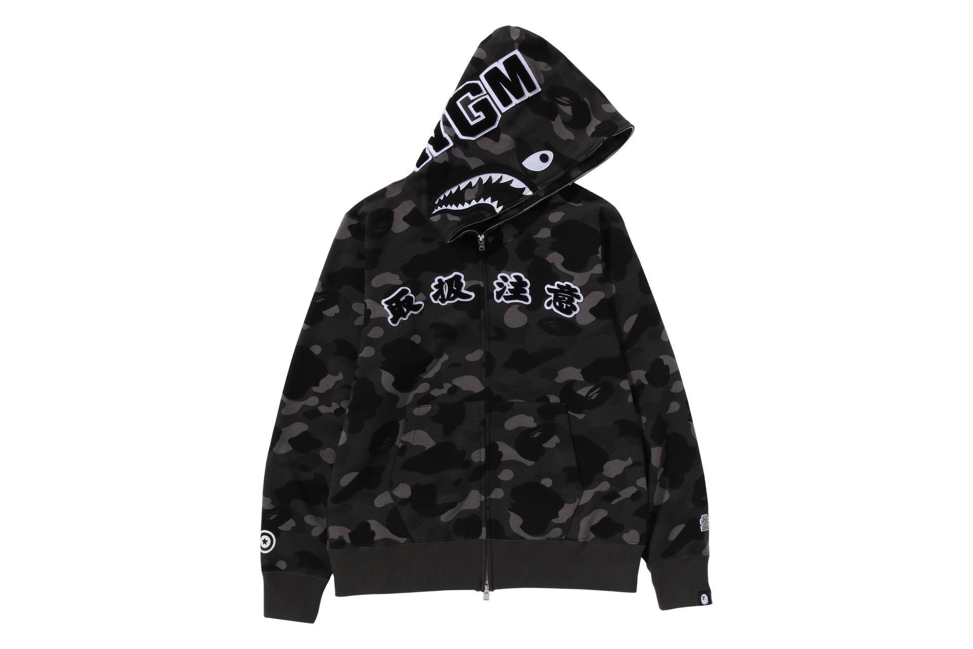 色落ちが美しいデニムパンツは、BlackEyePatchのイニシャル“B”とお馴染みの“取扱注意”を“STA”とミックスした特別なロゴを。ブラックの“BAPE®CAMO”をまとったスノボジャケットやシャークフーディ、スウェットパンツにも“取扱注意”のデザインを採用しています。