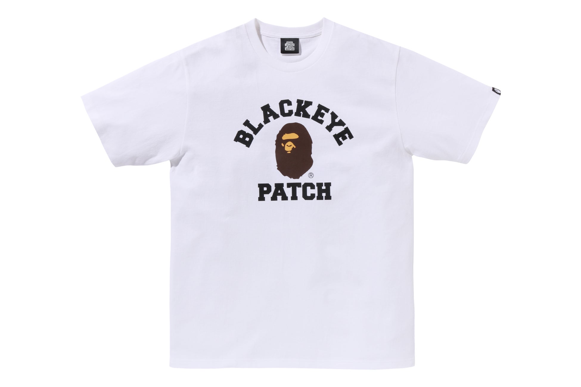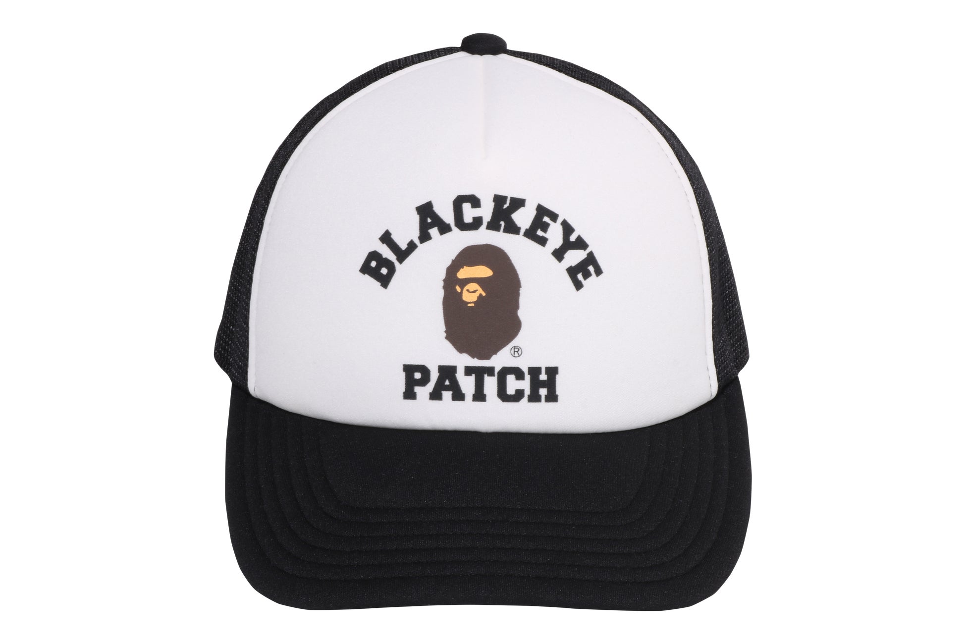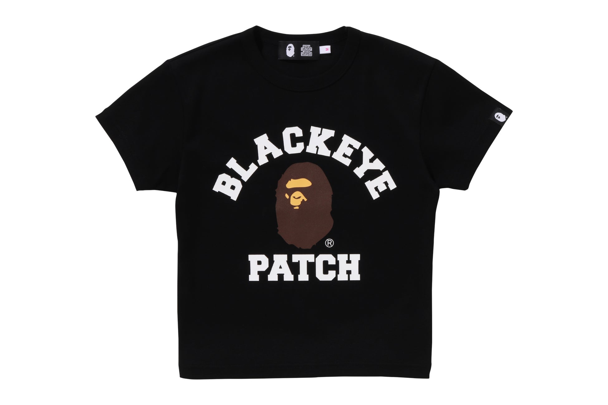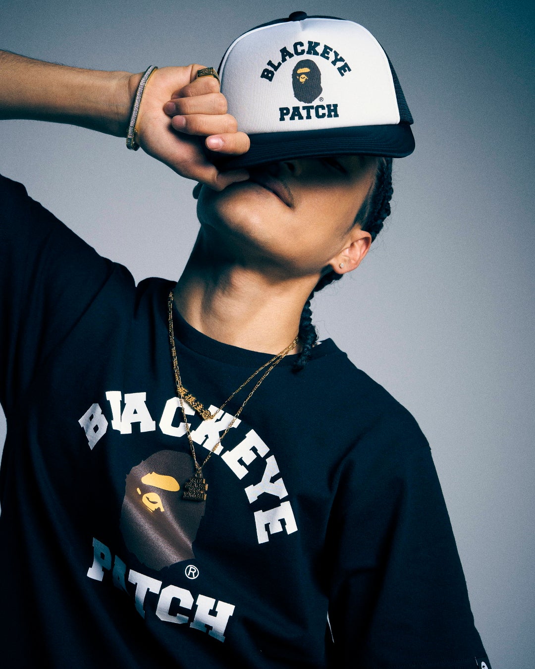 Tシャツとトラッカーキャップには、BAPE®の“COLLEGE LOGO”をBlackEyePatch仕様にアレンジしたグラフィックを採用。Tシャツはメンズとレディースの2型で、レディースは、90年代後半に若者の間で流行した“チビT”を彷彿とさせるデザイン