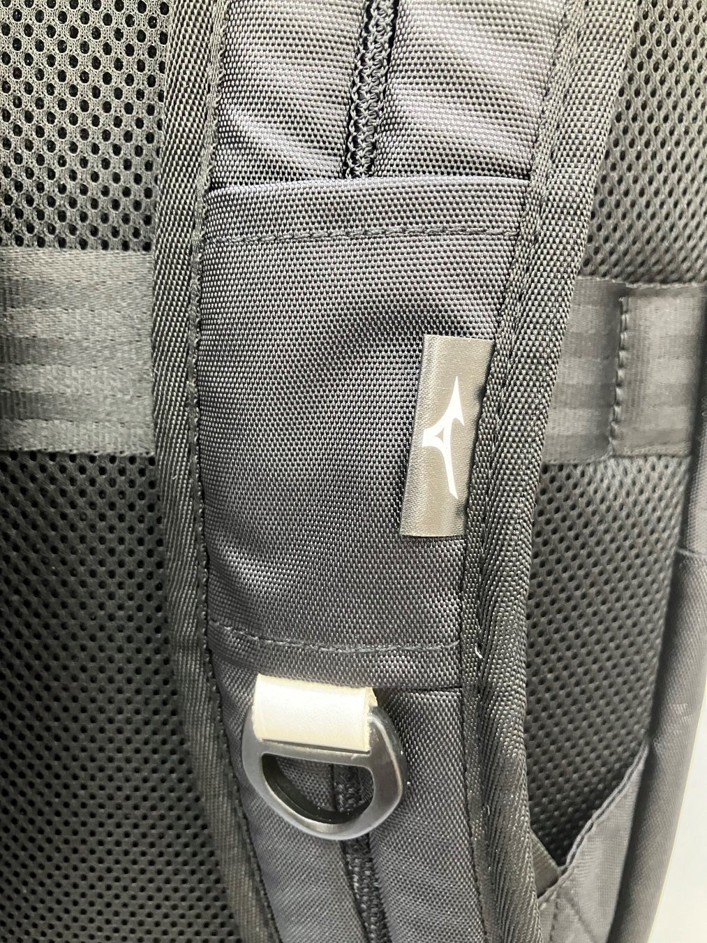またショルダーベルトには、ミズノがスポーツ用バッグに搭載し、特許を取得している「SPLIT-STRAP(スプリットストラップ)」を継続採用。左右2つに分割した独自構造により、重量感が分散され肩への負担を軽減(ミズノ従来品比)することに加えて、この分割したクッションが肩のさまざまな動きに対応しフィット感を向上させます。さらに、ショルダーベルトに備え付けているDカンストラップには使用ができなかった硬式野球ボ―ルの革を、ポケット内側の一部に競泳水着の生地廃材を使用するなど環境にも配慮した商品です。